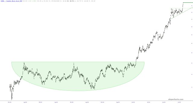 The right triangle pattern for OUNZ (an amalgam of gold and silver) gave the all-clear signal to this big rally.