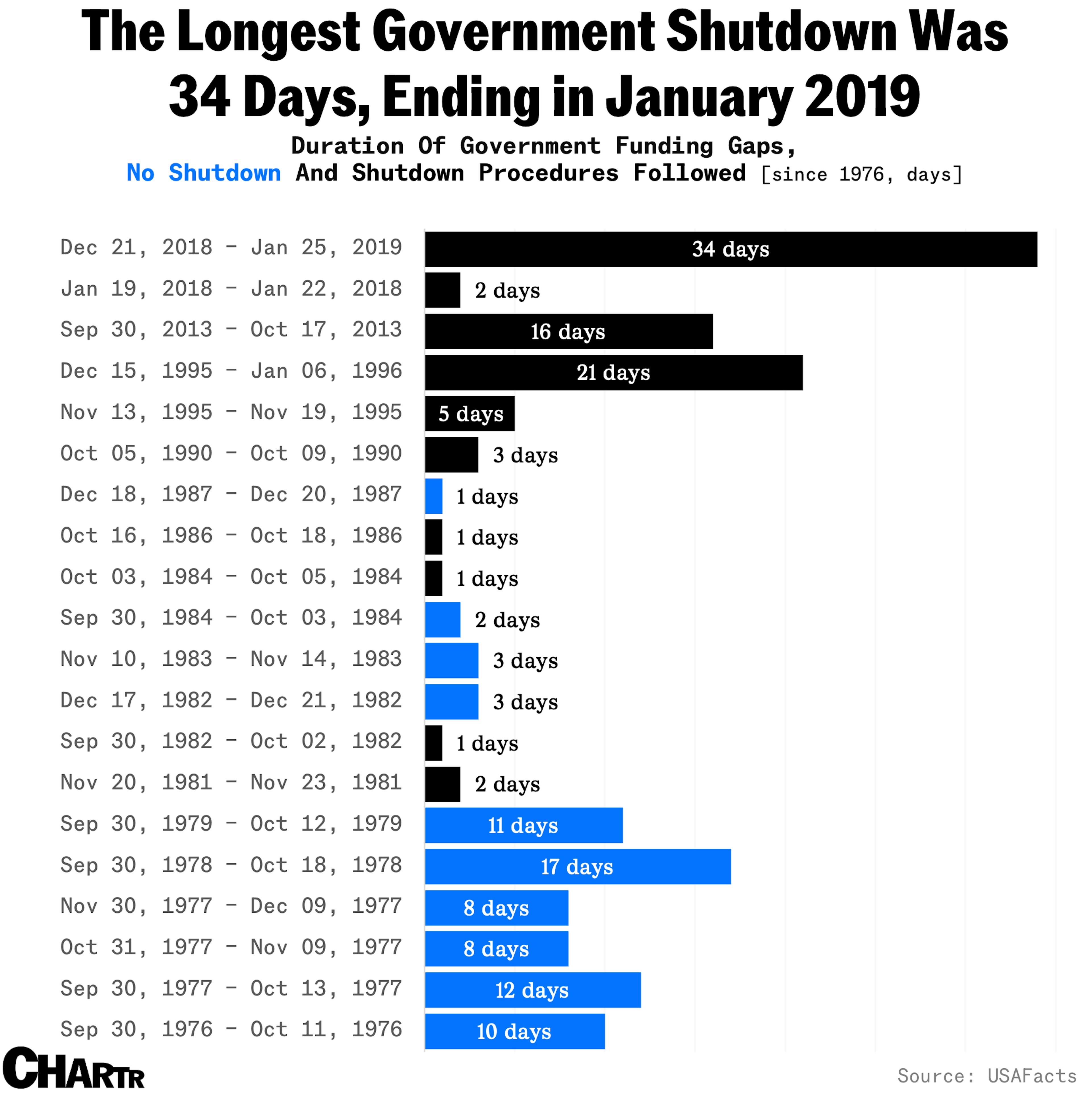 Trump was President during the last two. Since he’s so addicted to “winning“, maybe he can give us a new record length of shutdown! May I suggest a decade?