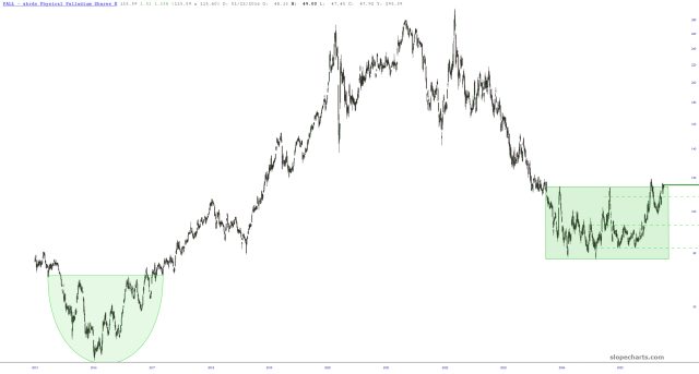 This is quite the pickle: on the one hand, gold and silver have blasted to nosebleed levels, which makes me very uneasy about buying palladium, since I think it would get dragged down by any serious tumble in PM. On the other hand, viewed utterly by itself, PALL looks like an amazingly good bullish setup. Argh!