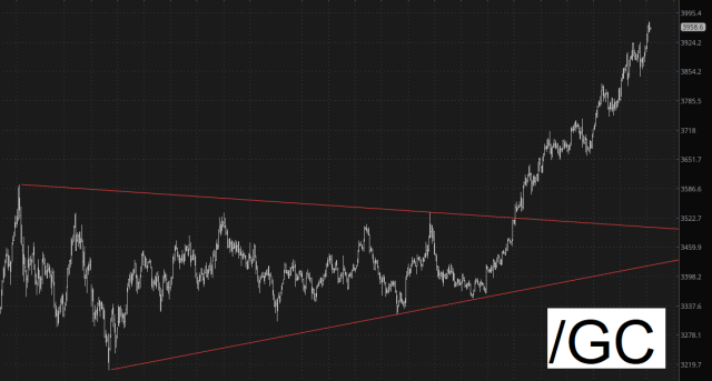 (more…)If there’s been one consistent winning sector this year, it’s precious metals. All the ratio charts and long-term projections have pointed to that, and, importantly, the Big Round Number of $4,000 on gold seems almost inevitable at this point. Gold has exhibited one of the cleanest symmetric triangle breakouts I’ve ever seen. Crossing $4k will generate a lot of press and excitement, although I suspect, short-term, it would soon be followed by a “Sell the News” kind of weakness.