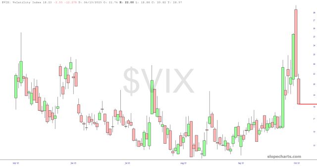 That sure didn’t last, did it? After weeks of languishing, the volatility index finally blasted higher on October 10th, moving from a 16-handle to a 22-handle. A few days later, it was almost up to 30, which is a near doubling of the VIX in a matter of just days. Between Friday and Monday, however, just about all the air left the balloon, and we’re back into the teens again, just like before. I wonder to myself if we will ever see a market again in which volatility lasts longer than a day or two.