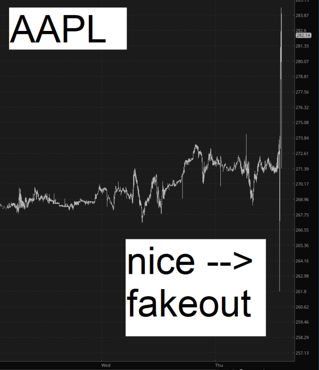 After the close, we’ll wrap up – – sadly – -the last two cool earnings announcements of this cycle. Indeed, for the entirety of 2025, only NVDA’s report (in a month) will break the boredom. Looking at these two, Apple and Amazon, it seems to me AAPL is best poised for more strength while AMZN is vulnerable to weakness.