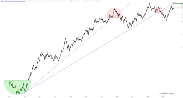 Yesterday’s AMD debacle was, in retrospect, an interesting gusher. Only after it was all over did I realize that the day’s high came within pennies of the lifetime high (see horizontal) and that the bar rammed right up against the long-term trendline and stayed stuck there.