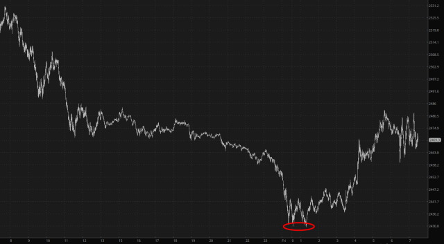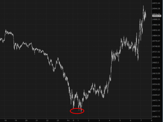 That is to say, a wonderful plunge followed by an inexplicable and utterly undeserved rally which undoes all the damage. Thus, the same /NQ that was getting deeper and deeper into the red last night managed to be bright green (of course) based upon, in all likelihood, something nice say about Xi instead of something mean. It’s like the global financial system is dictated by playground taunts and make-ups.