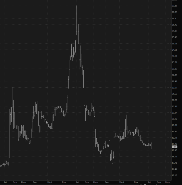 And, over the past two weeks, volatility has done a complete V-turn, exploding from 18 to 28 and back to 18 again.
