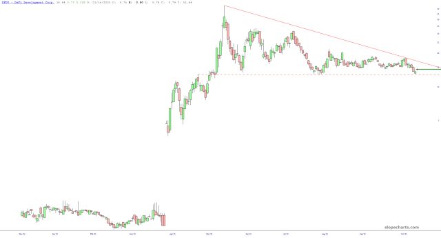 Below is a chart of DeFi Development (DFDV). I am sharing it simply because it has an exceptionally clean right triangle pattern which, if violated, portends much lower prices.
