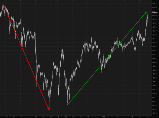 Equities continue to go absolutely nowhere. Here’s the /YM for the past week. Sure, there’s some smoke, but absolutely zero fire. It’s dead, Jim.