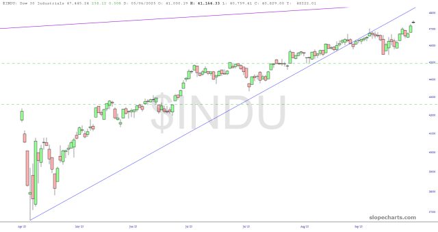 One unusual exception is the semiconductor index which, thanks to endless AI mania, has never dared to even fracture its own ascending trendline.