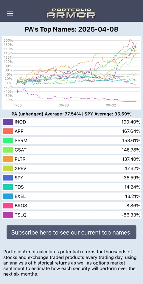One of the hardest things in trading is re-entering a name that’s already run. Our answer is to let the Portfolio Armor system give us the “license.” When a stock graduates into our Top Names again, that’s our objective signal that—regardless of how far it’s come—its six-month expected return still scores high enough to merit fresh risk.