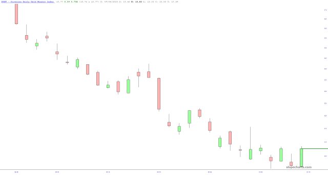 Indeed, DUST, the leveraged instrument that is bearish against miners, actually bottomed on MONDAY, which is pretty interesting considering what an insanely strong week GLD, SLV, and PALL have had.