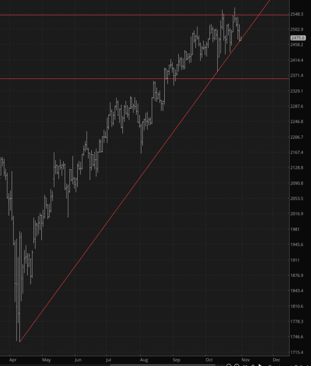 The reason “break down” is my preferred outcome is because this sucker is precisely at the breaking point of its trendline. It will take very little for this trendline to fail.
