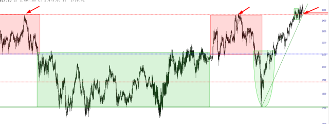This is even more important because of this very salient fact: a failure of the trendline would also mean that this crucial price level, which has been tested and failed twice already, would have failed for a third time. The three arrows mark this price point, and a break from here would, I think, indicate overall and persistent forthcoming weakness.