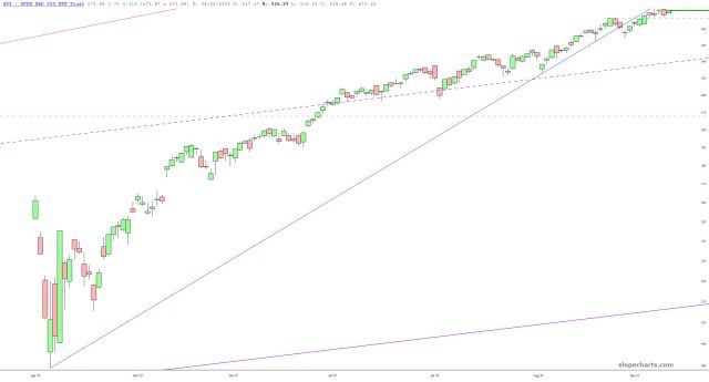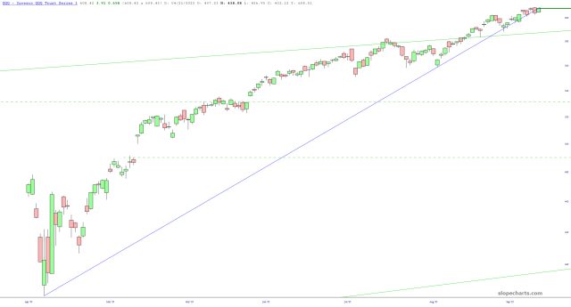 In spite of all the tech strength, the QQQ is almost the same story. It hasn’t broken its uptrend as cleanly as the DIA, but the line has definitely been fractured.