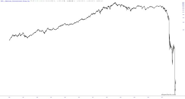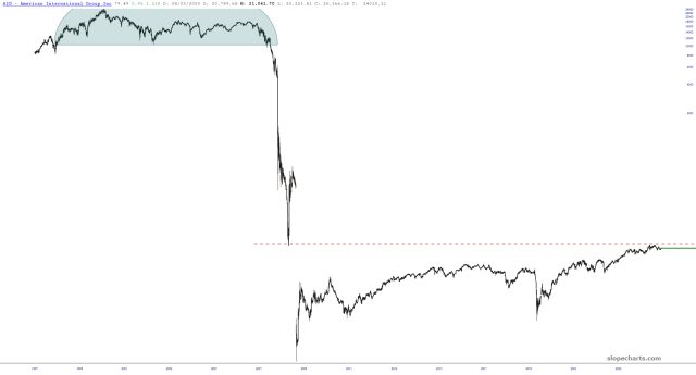 Instead, of course, the government threw trillions at the criminals and “saved” the financial system. Since then, AIG has basically been flopping around like a dying fish, still public, but a shadow of its former grand self. Again, it SHOULD have gone bankrupt, but it was kept afloat just like all the other should-have-died firms like JP Morgan and Goldman Sachs.