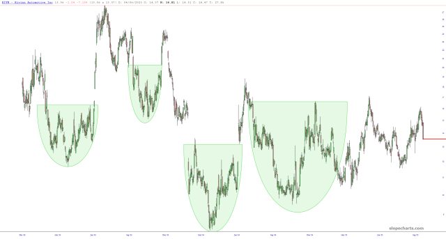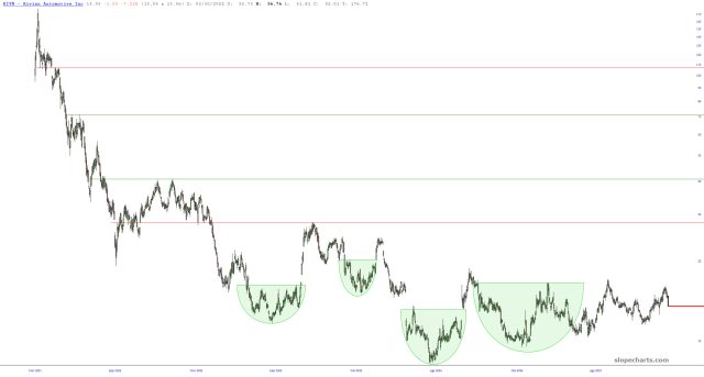 Here’s the bigger view. Longer-term, I do think it has probably bottomed and is trying to hammer out a meaningful reversal. Were it not for the fact that equities overall are nutty-high, I’d be awfully attempted to be a lot of RIVN.