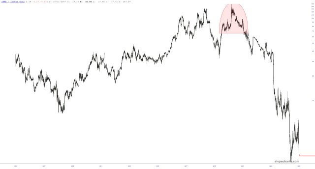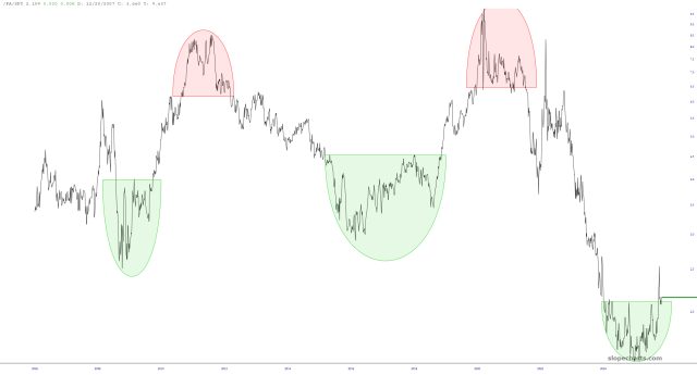 Attentive readers know all too well how obsessed I’ve been with ratio charts this year. The message has been unanimous and strong: bullish precious/bearish equities. I am particularly fixated on the lesser-known palladium, whose long-term value divided by the SPY yields a very bullish-looking base.