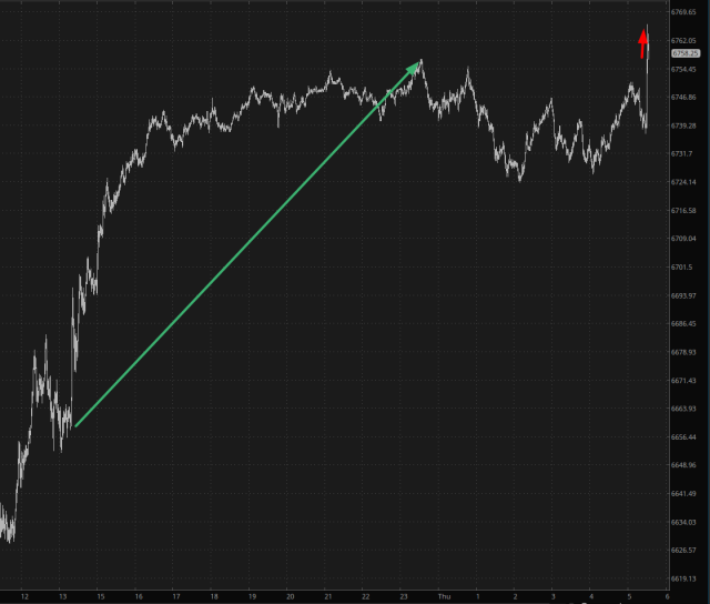 Yesterday evening’s Nvidia earnings slapped on trillions of dollars of recovered market value to stocks around the world. The chart of the /ES below shows the beneficial effect of the NVDA news (green arrow). This was augmented, but only slightly, by the jobs report which showed the unemployment rate had increased to 4.4% (more realistic figure: 24%) and that monthly earnings had increased less than expected (0.2% instead of 0.3%). Thus, as shown by the red arrow, the /ES got up to about a triple-digit overnight increase, with the /NQ up almost 500 points. Zowie!