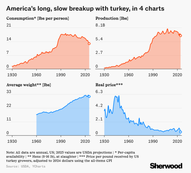Let’s face it: folks only care about turkey once per year. Interestingly it’s one of the few products out there enjoying a steady bought of deflation: