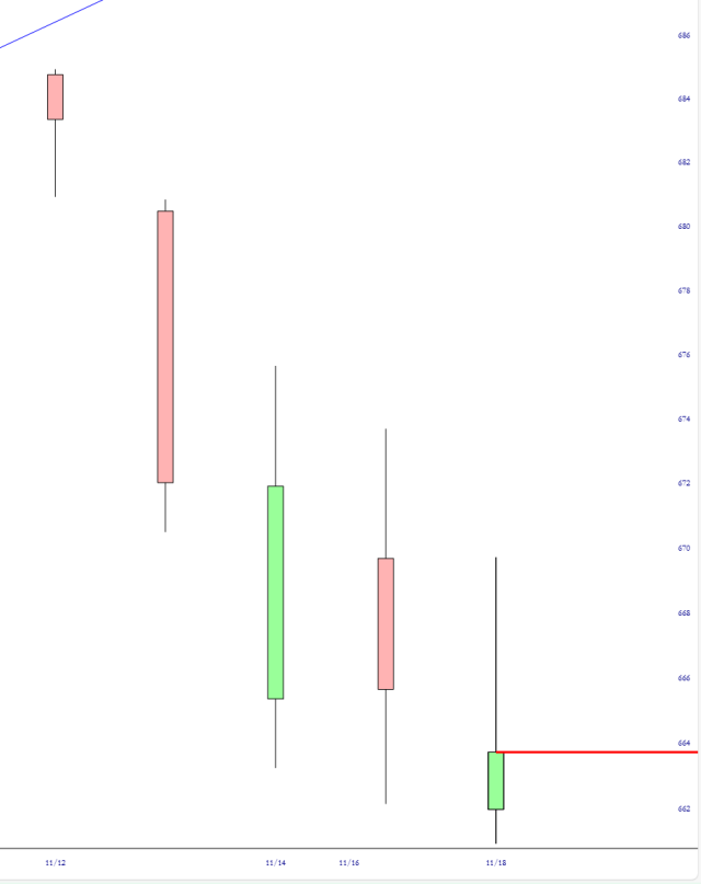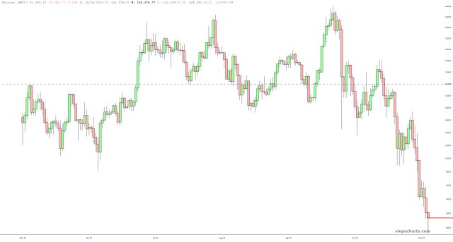 For the moment, the achievement that has me standing on my seat and clapping is that, for the fifth day in a row, we’ve pushed to a lower low. The major resistance (visible in the extreme upper left of this chart) was challenged but not broken, and ever since then it’s been a steady bleed-off with lower lowers and (so far) lower highs. To call this “refreshing” would be as understated as declaring that Kristi Noem does, in fact, make use of cosmetic products.