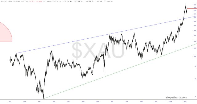 Lastly, precious metals will not, be immune to the asset liquidation. Seeing the gold sector beaten back down to its upper trendline would serve as a good buying opportunity.