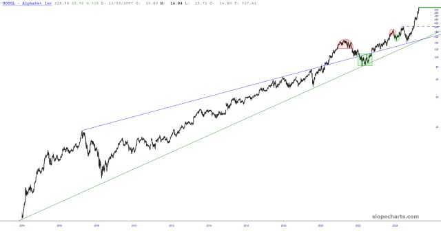 With all the attention focused on the likes of NVDA (whose FOUR MONTH price change is ZERO), I think Alphabet (GOOGL) deserves a round of applause. This sucker has added a TRILLION dollars in shareholder value in a matter of weeks, pushing to lifetime highs seemingly ever day.