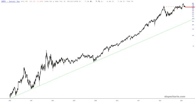 Markets keep lurching higher, which is something is a Thanksgiving tradition in equities, with stocks indexes up a little less than one percent across the board. One of the VERY stock items in my portfolio that’s recently red is Intuit, which has been sputtering for many months now. I’ve tightened up my stop on INTU to $652