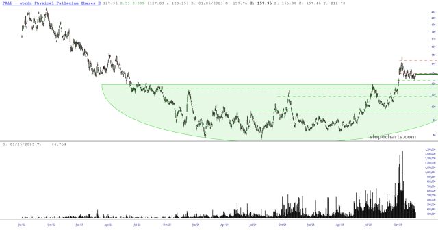 I’ve written many times about palladium, specifically the PALL fund, which I am long. At this point, the big test is whether it can push past the line just beneath $130.