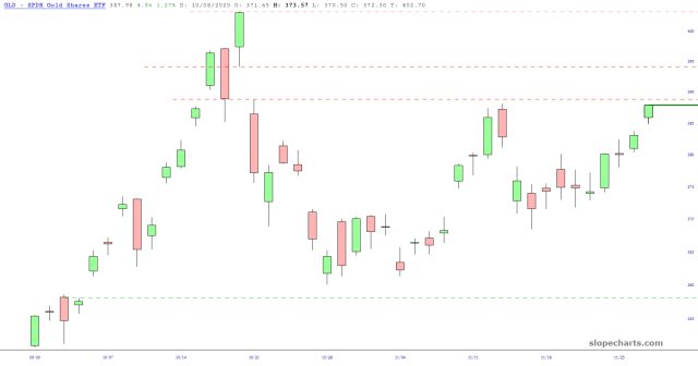 It’s up to gold at this point. Below is GLD, and I’ve provided three horizontal lines of resistance. Knock these out of the way, one by one, and we can start the trek to $4,000, which I’m highly confident we’ll reach early in 2026.
