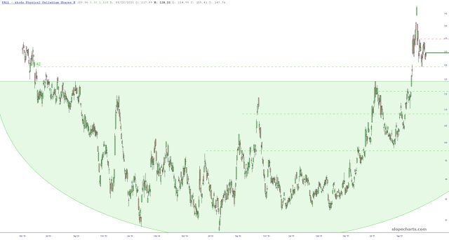 I am entering this long by way of the PALL fund which, thinly-traded as it is, still represents the best way to go about this. My stop-loss is set at that dashed green line. If it fails, I’ll wait until about $116 or so. However, if we push past that red dashed line (which is the price gap above), I will add the rest of my long position at worse (but more encouraging!) prices.