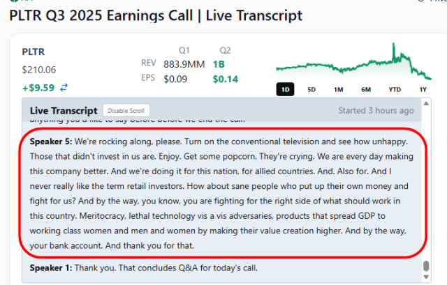 Also, important, weirdo Alex Karp’s company Palantir (supported by power bottom Peter Thiel and the most corrupt government since the age of Nero) produced killer earnings last night, which produced a spike lasting just moments. Since then, it has been grinding lower, as folks realize that fiat is better than the most overpriced company in human history.