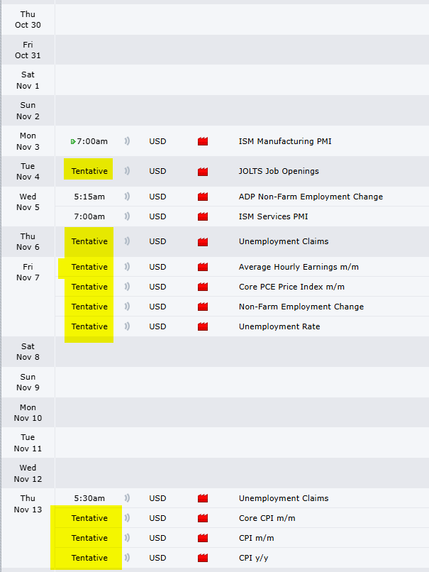 So long as the government stays shut down (have you noticed?), you can expect no data to be rolled out to move equities. All “Tentative” means is that there won’t be data if D.C. remains shuttered. Embrace boredom.