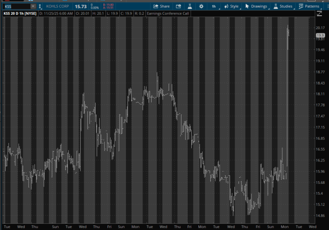 Of all my positions, the only straight-up stinker this morning is Kohl’s (KSS) which is rocketing higher and whose ascent wil eject it not only from my positions but from my Bear Pen altogether. Oh, well. That’s what a diverse portfolio is for. No one position is ever going to be big enough to really cause lasting damage.