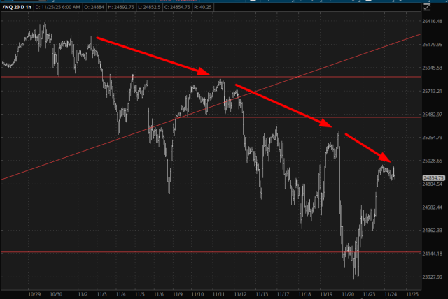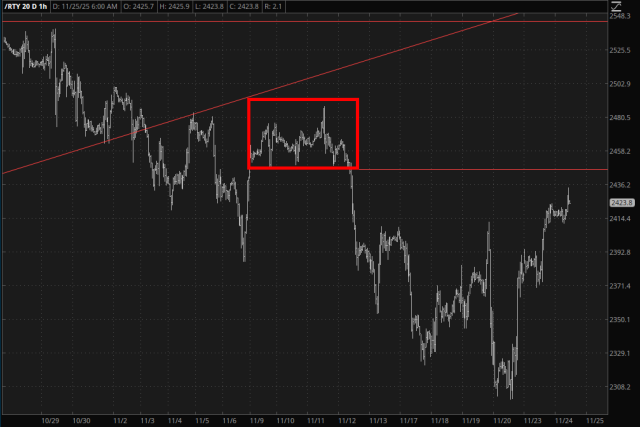 The NASDAQ makes this point as well, although with a different pattern. I see the permabulls of the world (like Tom Lee, who is perpetually changing his year-end predictions, which is a bit silly in late November, wouldn’t you say???) are back in full force, but I think anyone buying into this market is clinically insane.