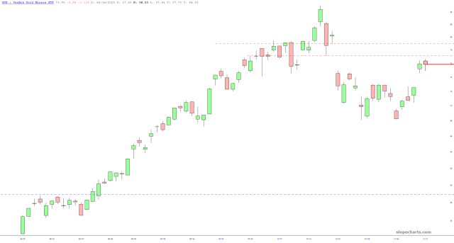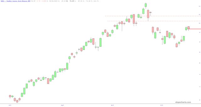 As I mentioned, I bought DUST this morning at 10.08 with a stop at 9.65. The charts of the miners suggest to me they’re about to turn south.