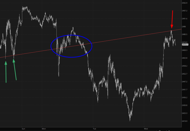 Today, of course, the market rallied mightily, but even in the face of such dire adversity, I did another premium post which pointed out that all that buying had merely pushed prices back to perfect points of resistance. As I stand here on Wednesday evening, that continues to be true, with a pixel-perfect tag of the trendline executed by the /RTY.