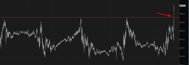 Since the nation is only $38 trillion in debt, the Fed figures – – why not MORE quantitative easing? Thus, they’ve announced that they’re going to flood the market with even more liquidity, which has caused the /RTY to finally blast above resistance to lifetime highs. I had bought some $253 IWM puts and sold them for a whopping $300 profit a minute before the announcement. Good thing, too, as they’re getting nuked now.