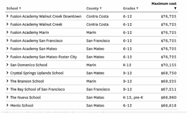 I just saw this updated list of tuitions for schools (not colleges, but things like elementary school) in the Bay Area. Let me just say I’m glad to be done writing checks like this, because one of the Rs is “Refinance your house to pay for this stuff.” These aren’t boarding schools, by the way. This is just tuition, and trust me, the schools hit up the parents all year long for additional donations and contributions!