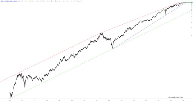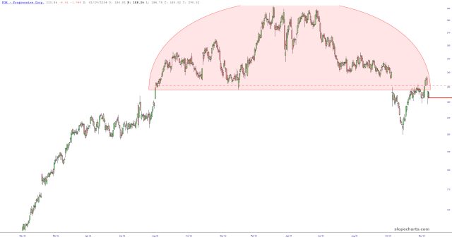 On this otherwise grim day for any bears out there, I must once again push some charts forward on my desk and pound my fist about one particular item: Progressive Corp. (PGR). True, this is a boring old insurance company with a ho-hum, not-at-all expensive P/E of 12, but this is seriously one of the cleanest looking topping patterns I’ve ever seen. Indeed, this is my largest non-ETF short position and the only equity on which I’ve “doubled down” and bought put options.