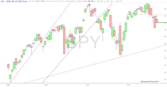 Trading hours are usually sacrosanct to me, but I made an exception today for Mochi’s first puppy class. Even so, I’m managing to put together a post. What was curious to me was that, just before I left my office, the market spiked higher (especially gold) which was making a not-great day even worse. By the time puppy class started, though, the spike had vanished, and the market had softened. Importantly, today’s high did not push past my resistance line (dashed red):
