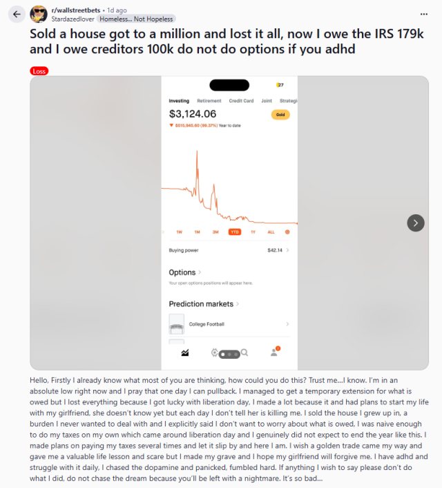 OK, I may kick myself for not doing a better job holding on to my palladium long, but at least I didn’t sell the family house, put all the cash into options, lose it all, and then owe taxes with money I don’t have. So, I’ve got that going for me.