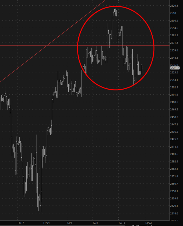 Welcome to the final full session Friday of 2025. It’s fairly quite this morning, with equity futures marginally higher but, longer-term, slowly weakening. The /RTY, for instance, is up 0.19% as I’m typing this but is well-positioned to fall for the balance of the year.