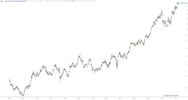 As everyone knows, metals have gone berserk lately. As I’m typing this, my frenemy palladium is up over $200 per ounce (!!!!!!) which is over 11% just in the first 45 minutes of trading. Precious metals mining ETFs like GDX, GDXJ, and SIL (below) are raging higher as well.