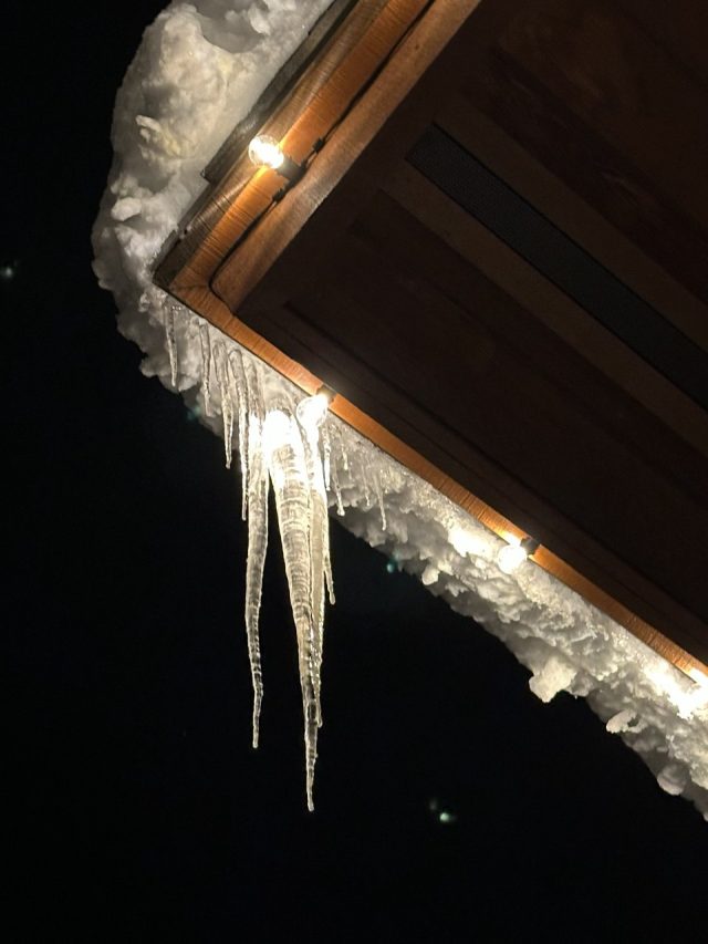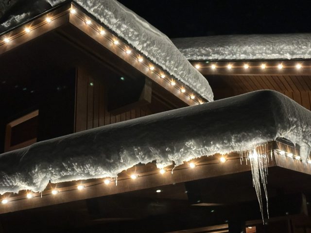 Thanks to the events of 2025, we are enjoying a splendid family encampment far from the bustle of society. It’s as close to paradise as can be, and I took a few photos of my favorite element of it right now, which are the lights I set up along the roofline.