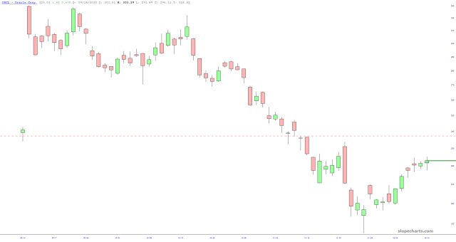 It wouldn’t last, though. That explosive move was wiped out, and then the market kept pounding the price lower. As of this composition, Oracle’s price begins with a $1____ instead of a $3____ (the nightly bang-up isn’t reflected in this daily bar chart).
