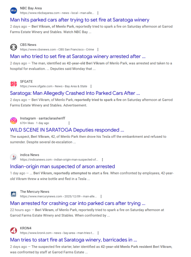 Beri Vikram, of Menlo Park, reportedly tried to spark a fire on Saturday afternoon at Garrod Farms Estate Winery and Stables.