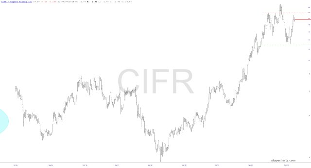 I’ll also throw a new idea into the mix: Cipher Mining (CIFR) which appears to be hammering out what could be a well-formed H&S reversal top.