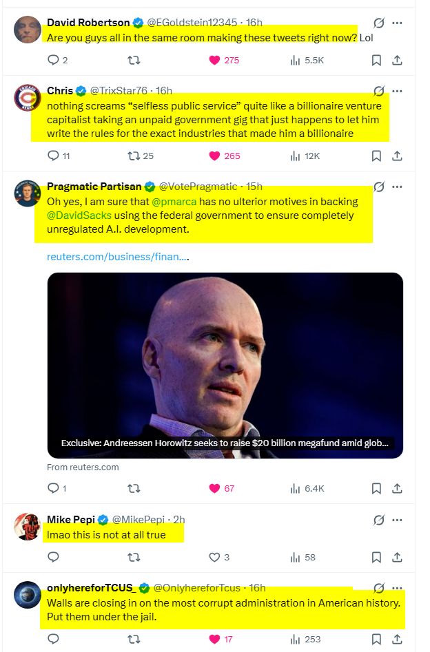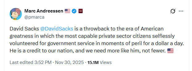 I have a special dislike for Sacks since, back during the Silicon Valley National Bank bailout (which he supported) I suggest he was a Private Profits/Public Losses kinda fella, which led him to ban me, thus creating an accidentally hilarious juxtaposition on my Twitter account:
