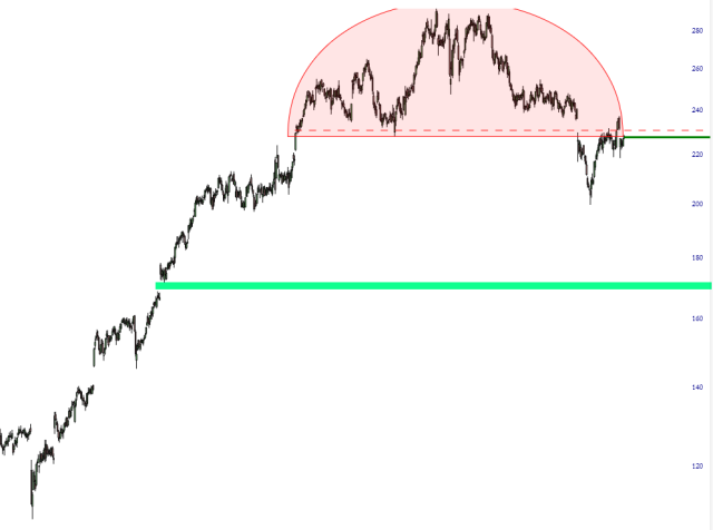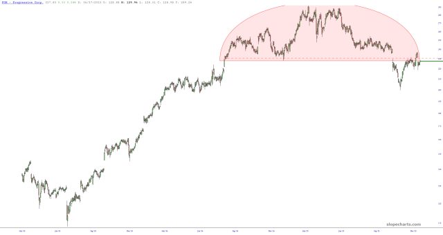 One in particular, Progressive (PGR), I really like as a long-term short. I am both short this and own June 18 2026 puts. This is an exceptionally well-formed head and shoulders top.