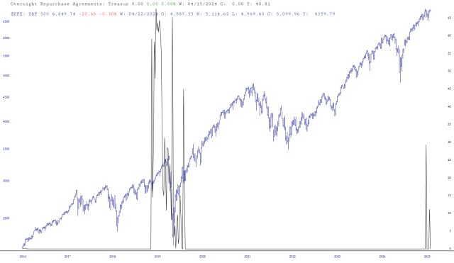 Reverse repo (draining liquidity) surged during the Fed’s inflation fight. Then it drains as the Fed eased policy. This was “adding” liquidity by reduced in the liquidity drained. As it gets to zero recently, overnight repo spikes, as if the trend kept continuing.