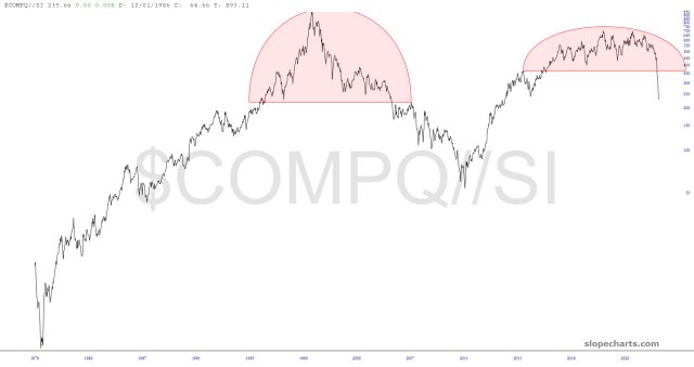 The NASDAQ Composite divided by silver finished its topping pattern weeks ago. What’s remarkable is how the price action plunged beneath the completed top with far more force than the prior instance.